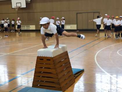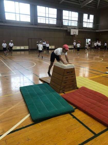 開脚跳び以外に台上前転も練習しています。