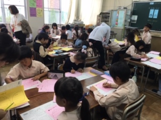 道徳で、「お互いに感じたことや考えたことを伝え合おう」という学習をしました。自分と友達とそれぞれ皆違っています。同じものを見て感じ方や感想も違います。それらを出し合い、伝え合うことで相手への理解も深まります。友達へのメッセージを最後に書きました。
