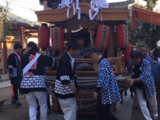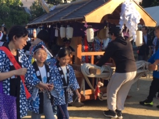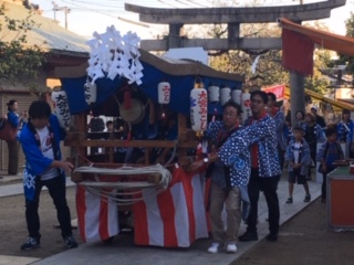 秋晴れの下、第41回大宮みこし会秋祭り巡行が、今日、明日と行われます。4年生以上の子ども達が太鼓や鉦をたたかせてもらっています。夏頃から毎週土日に地域の方々から教えてもらっていました。低学年の子も一緒に歩いて参加し