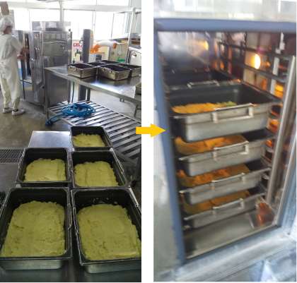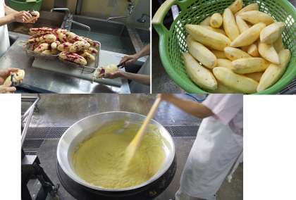 給食室では、今が旬(一番おいしくて栄養があり、たくさん採れる時期)のたくさんのさつまいもの皮をむいてスイートポテトを作ってくれました。さつまいもを煮崩れる程度まで煮て砂糖、バター、牛乳、クリームを加えると、滑らかに仕上がるように丁寧に煮ながら芋をつぶしてくれました。焼き物機でこんがり焼いたスイートポテトは子どもたちに大人気でしたよ。