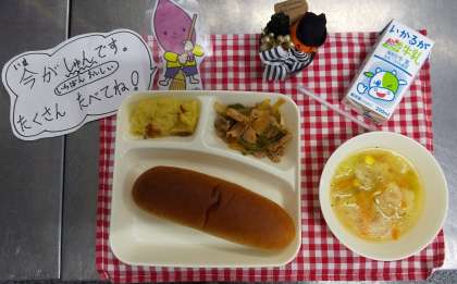 今日の給食は、豚肉と野菜のケチャップソテー、スープ、スイートポテト、黒糖パン、牛乳でした。