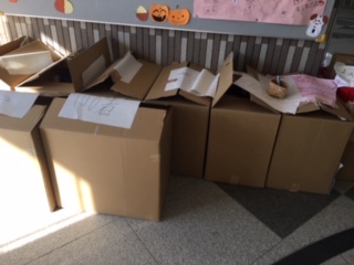 0着ずつ入れた段ボール箱が8箱近く集まっています。