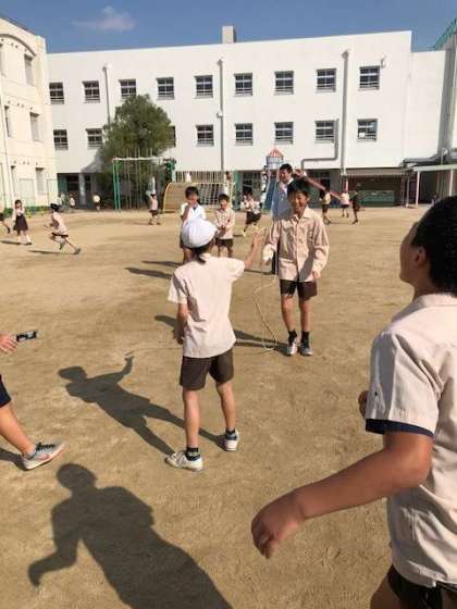 体を動かすことが大好きな5年生は、昼休みも教頭先生を見つけて八の字とびをしていました。
