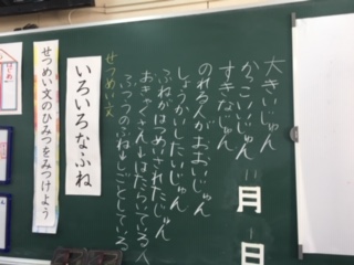 「いろいろなふね」の学習です。教科書に出ている4つのふねが、なぜこの順番に並んでいるか考えました。大きい順、乗れる人が多い順、かっこいい順、紹介したい順なと、子ども達は自分なりの理由を考えて発表しました。らまた、自分達が調べている他のふねが、どこに入るかも考えました。あまりみんなか知らないようなふねもちゃんと調べて知っていて、さすがです!