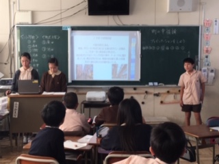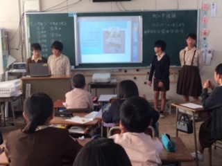 「町の幸福論」の学習で学んだことを生かして大宮小学校、大宮地域の良さを調べ、プレゼンテーションをしました。分かりやすく伝える工夫を凝らしています。この学習を通して、学校や地域を見直し。もっと好きになってくれるとうれしいですね。