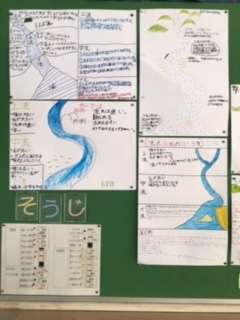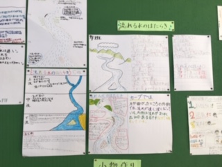 「流れる水のはたらき」の学習でわかったことを班でまとめています。