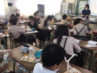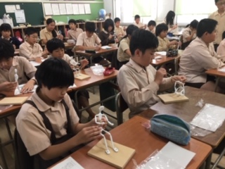 「12年後の自分」を粘土で作っています。芯の部分に麻紐を巻きつけて、胴体などの太さを加減しています。12年後の自分。どんな風になっているのかな。いろいろ思い描きながら製作しています。