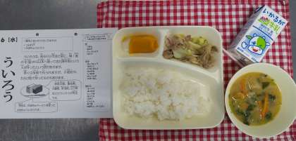 今日は、かぼちゃういろうの他に豚肉とまいたけのいためもの、つみれ汁を組み合わせた米飯献立でした。