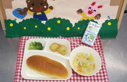 今日は、白身魚のフリッター、スープ煮、ブロッコリーのサラダ、おさつパン、牛乳でした。