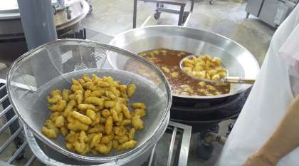 フリッターは、肉、魚、野菜、果物などに泡立てた卵白(メレンゲ)や小麦粉で作った衣をつけ、油で揚げた洋風の揚げ物です。今日は、今頃から寒い時期に旬を迎える鱈(たら)に卵を使わない衣をつけたものを給食室で揚げました。