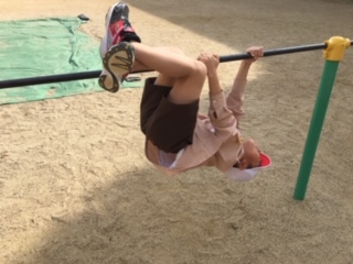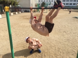 今日は、昼間はとてもあたたかでした。1年生が、鉄棒に挑戦していました。
