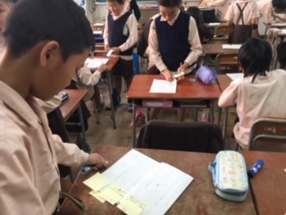 国語の学習で、一人一人が物語を作りました。互いに見合って、良かったところ、工夫しているところなどを付箋に書いて交流しています。友達からほめてもらったり、励ましの言葉をもらつたりするとうれしいですね。