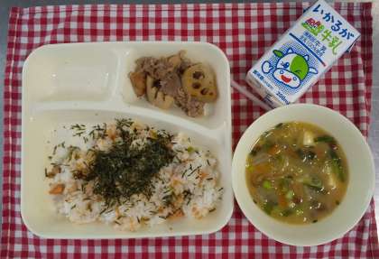 今日は福島区野田小学校の昨年の6年生が考えた献立で、さけとこまつなのご飯、豚肉とれんこんの甘辛焼き、冬野菜のみそ汁、牛乳でした。