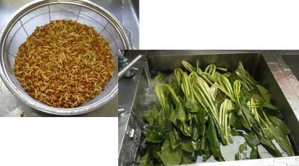 まぜご飯の作り方を聞きに来た児童が数名いました。鮭フレークと小松菜を熱した油で炒め、砂糖、料理酒、塩、うすくち醤油、水を加えて更に炒めて最後に入りごまを加えます。これを炊けたごはんに混ぜ合わせて刻みのりをふります。簡単なので、ぜひご家庭でもお試しください