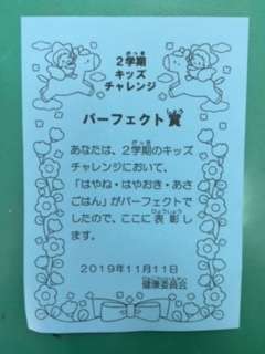 パーフェクト賞の発表では、100人近くの人が賞をもらいました。担任の先生から手渡されました。「早寝・早起き・朝ごはん・メディア時間」次回も頑張りましょう!!