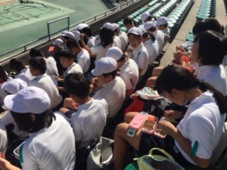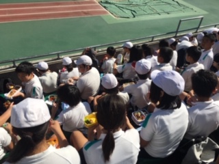 お弁当タイムが終わり、今から、ヤンマースタジアムに移動です。午後からは、リレーと100mタイムを計ります。