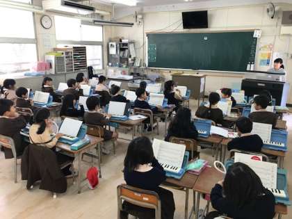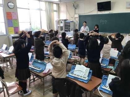 音楽にあわせて体で楽しく表現したり、けんばんハーモニカで「かえるのがっしょう」を練習したりしました。