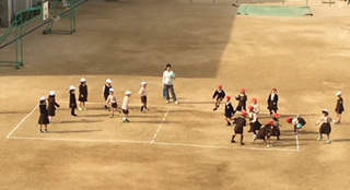 今日は、小春日和。ポカポカとてもいい気持ちでした。運動場では、1年生が、みんなで仲良くドッジボールをしていました。