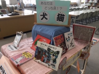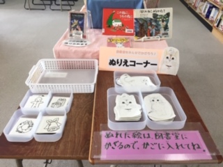 図書室にできるだけたくさんの人が足を運んでくれるように、いろいろ工夫をしています。犬猫の本のコーナーの横には、ぬり絵も置いてあります。本が苦手な人も、ぬり絵を楽しみながら、ページを開いてみては?