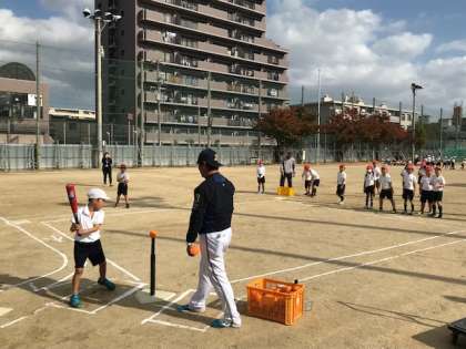 プロ野球のオリックスバファローズの方に来ていただき、出前授業をしてもらいました。バットやボールを使い、楽しそうに体を動かし、野球の楽しさを味わいました。