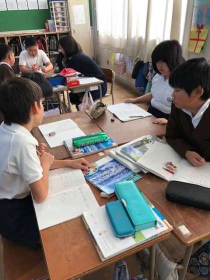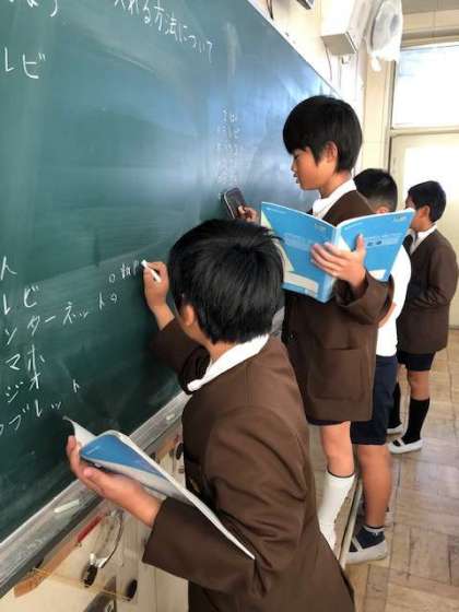 班で意見を交流し合い、班長が意見を集約し、前の黒板に書きにいきます。