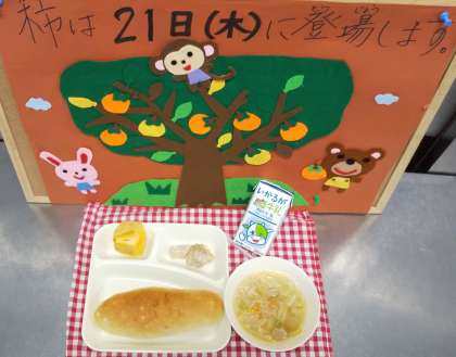 今日の給食は、鶏肉のガーリックマヨネーズ焼き、スープ、かき(富有柿)、おさつパン、牛乳でした。