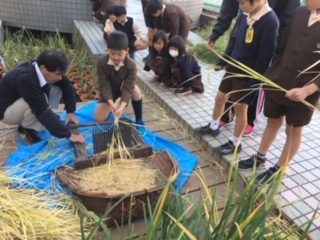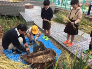 5年生の残りの稲穂をもらい、千歯こきを体験しました。ズズズッとモミが取れて、「ストレス解消!!」と叫んだ子もいました!
