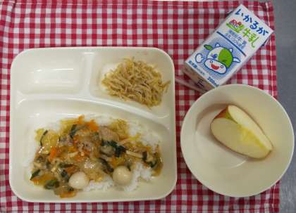 今日の献立は、中華丼、もやしの中華あえ、りんご、牛乳でした。