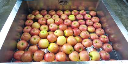 今日は青森県産のリンゴを440人分用意しました。冬の寒さに負けないように、旬の食べ物を食事に取り入れて元気に過ごしましょう。
