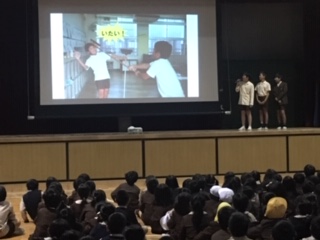 靴ひもがほどけていたり、給食エプロンなどの袋の紐が長すぎて垂れ下がっていたり、前を見ずに教室から走り出たり、友達と軽い気持ちで放棄などを振り回していたりした時に、けがは起きています。今年度のけがの数が、1100を超えていると知り、みんなはびっくりしました。スライドを見ながら、「ある、ある」と、頷いていました。今日の発表を聞いて、一人一人がけがをしないように心がけてほしいと思います。原稿をまとめたり、発表の練習をしたり、大変だったと思いますが、原稿を見ずに説明できてとても立派でした。健康委員会の皆さん、ご苦労様でした。