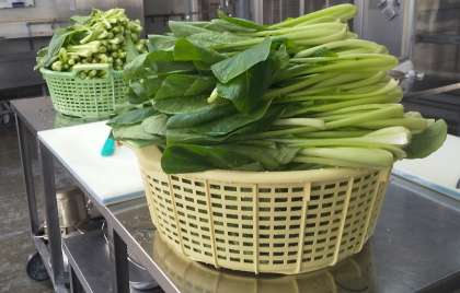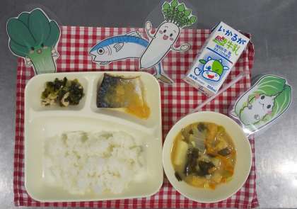 今日の献立は、さばのみぞれかけ、みそ汁、こまつなの煮びたし、ごはん、牛乳でした。旬の食べ物として、青背の魚のさば、みぞれかけには大根とゆず、煮びたしに小松菜、みそ汁に白菜や白ねぎを使用しました。雪が空中で溶けかかって雨と混じってふる様子をみぞれと言います。これを大根おろしなどで表現した料理のことをみぞれかけと言います。さっぱりした味つけで魚が苦手な子も食べやすかったようです。