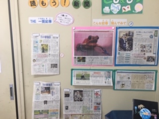 子ども新聞のトピックニュースから切り抜いて掲示してくださっています。関係する本の掲示もあります。