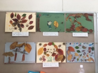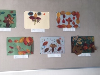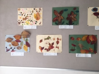 大宮ふれあい公園などで拾った落ち葉を使って、表現しました。鳥や花、動物などそれぞれに工夫して表しています。