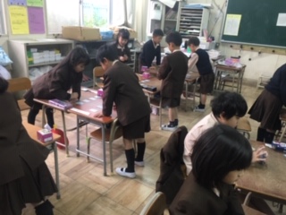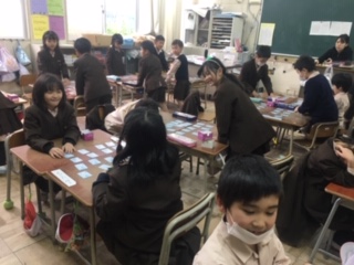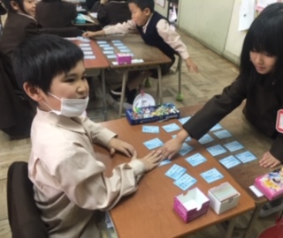 五色百人一首を2人組でやっています。青色の札だけですが、よく覚えていて、取るのがとても速いです。2月の参観で、百人一首大会を行います。