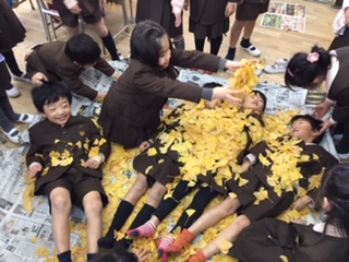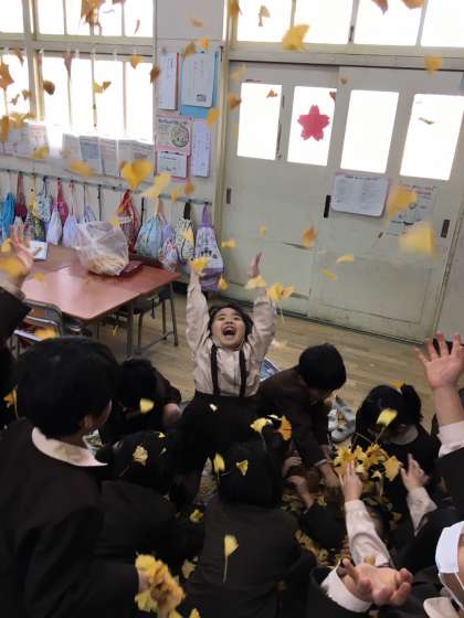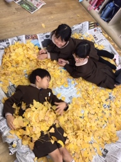 イチョウの葉をたくさん拾って持ってきた1年生。葉っぱの布団で遊びました!