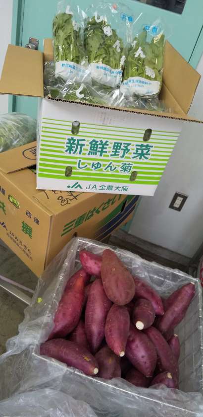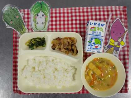 今日の献立は、豚肉のしょうが焼き、さつまいものみそ汁、きくなとはくさいのごまあえ、ごはん、牛乳でした。きくなは一般的には春菊(しゅんぎく)とも呼ばれています。菊の葉によく似ていて春に菊のような花を咲かせるのでこのように呼ばれています。鍋物にも合いますよ。