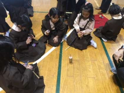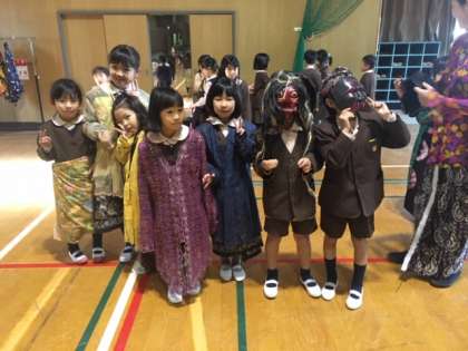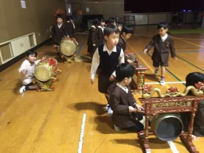 ガムランという打楽器やインドネシアのコマ、民族衣裳などを体験させてもらいました。劇や遊び、音楽などを通して、インドネシアという国に少しだけ触れることができました。あと2回、三学期に文化に触れる体験をする予定です。