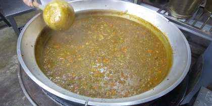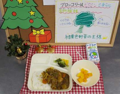 今日の献立は、冬野菜のカレーライス、ブロッコリーとコーンのサラダ、黄桃(カット缶)、牛乳でした。今日のカレーには、大根、れんこんなどが入りました。サラダにはブロッコリーも入り、旬の野菜パワーいっぱいでした。ぜひ、おうちのカレーにもお試しください。
