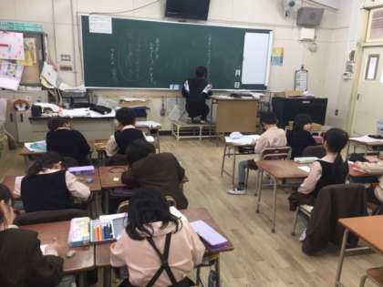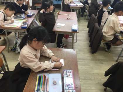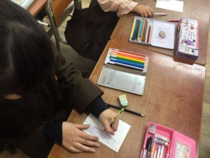 モデルの文を見ながら年賀状を書きました。3学期にがんばることを書いています。