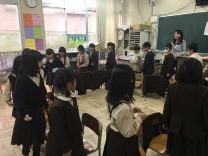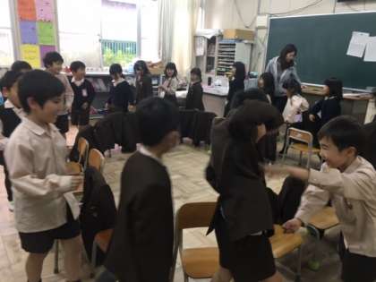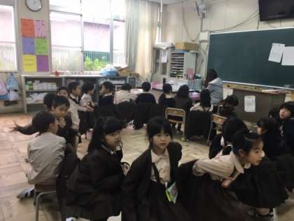 椅子取りゲームをしていました。12月になって給食の時間に毎日放送される「きらきら星」の英語バージョンをすっかり覚えていて、歌いながらゲームをしていました!