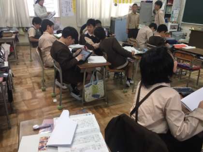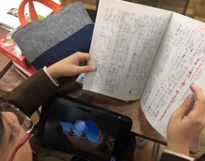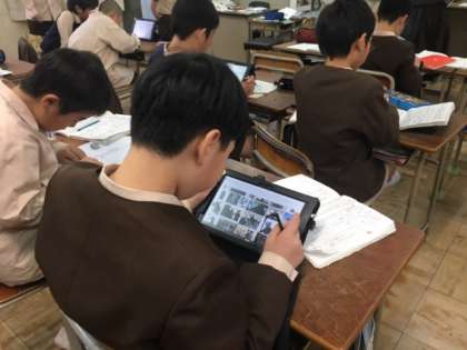 タブレットで調べ、教科書教材で学習したまとめ方(効果的な説明の仕方)を考えて、リーフレットの形も着物など、和テイストで工夫をして作っています。楽しみながらしっかり書いているのがよく分かります。