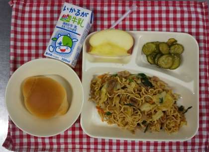 今日の献立は、オイスターソース焼きそば、きゅうりの中華あえ、りんご、ミニ黒糖パン、牛乳です。