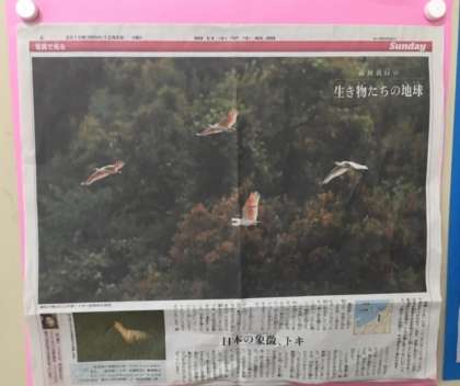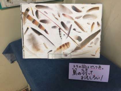 小学生新聞の切り抜きを毎週図書支援員のIさんが、掲示してくれています。今は、トキの記事と関連して鳥の羽の図鑑を用意してくれています。