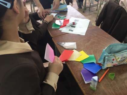 折り紙で、リースを作っています。色の組み合わせ赤と緑だけのクリスマスカラーとか、カラフルなものとかいろいろ考えて作っています。