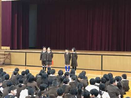 3年生が、大宮ジュギングデー、漢字テスト、算数のあまりのあるかけ算、給食、早起きなど3学期にがんばりたいことをみんなの前で発表しました。