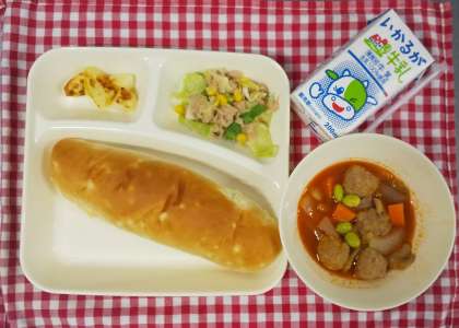 今日の献立は、ミートボールのケチャップ煮、ツナと野菜のソテー、焼きじゃが、おさつパン、牛乳でした。どのクラスも食缶空っぽで、「おいしかった。」と好評でした。