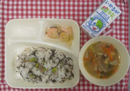 今日の献立は、昨年の瓜破西小学校6年生が考えたもので、栄養たっぷりえだまめひじきご飯、さけのさわやかレモン焼き、冬野菜のみそ汁でした。「色どりを意識して、見た目も味も食感も楽しんでもらう健康メニュー」というねらいどおり、子どもたちにも好評でした。毎日の献立のレシピは大阪市教育委員会のホームページ(小学校⇒小学校給食)からご覧いただけます。ぜひご活用ください。