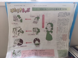 子ども新聞の記事が、廊下に掲示してありました。「好きな事を仕事に」それと対照的に、「好きな事を仕事にしない」という記事も。興味深いですね。