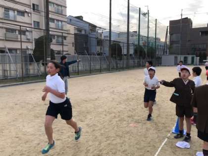 体育では、持久走に取り組んでいます。ペアで「今、◯周!」と声をかけ合いながらチェックしています。
