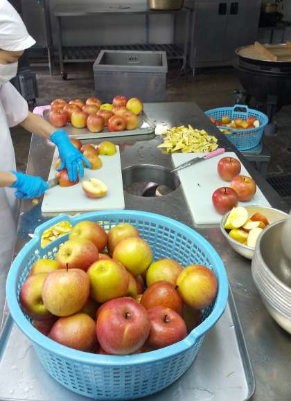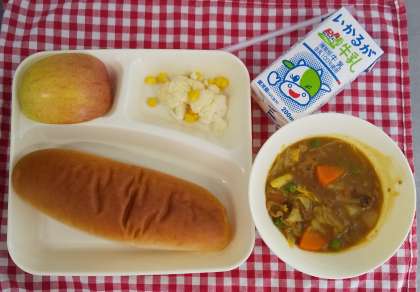今日の献立は、豚肉と野菜のカレー煮、カリフラワーとコーンのサラダ、りんご、黒糖パン、牛乳でした。